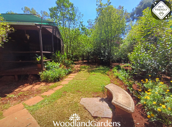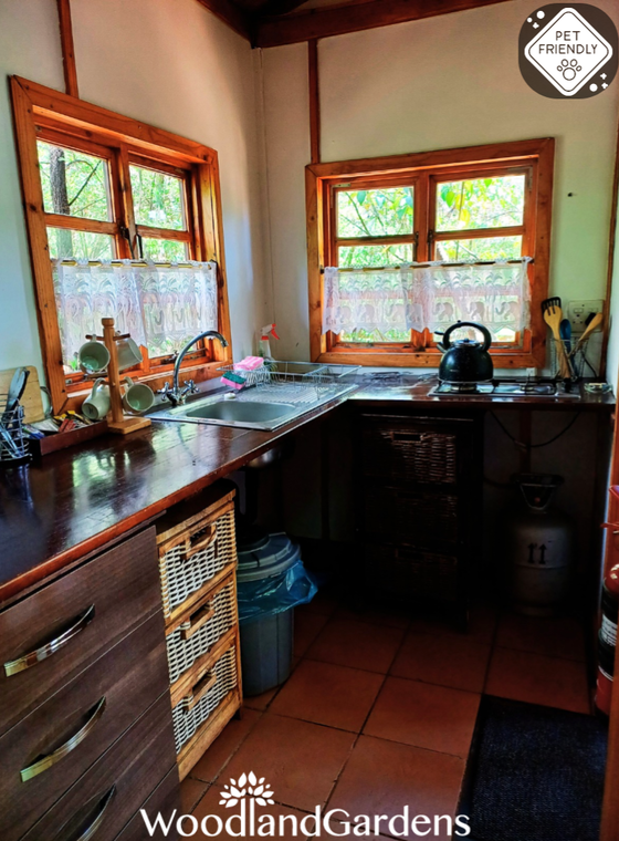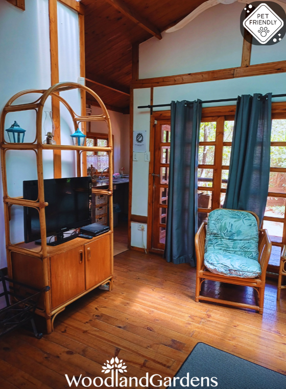 Open plan bedroom (king sized bed or two singles) with a fireplace, TV monitor with media ports (no DSTV) and a DVD machine. Separate bathroom with a shower (attached outdoor bath house). Small open plan fully equipped kitchenette (regrettably no oven, stove only). Doors opening onto a veranda, with tables and chairs overlooking a privately enclosed fenced and gated garden equipped with braai and bonfire areas.
