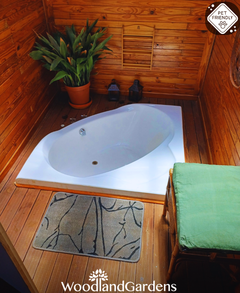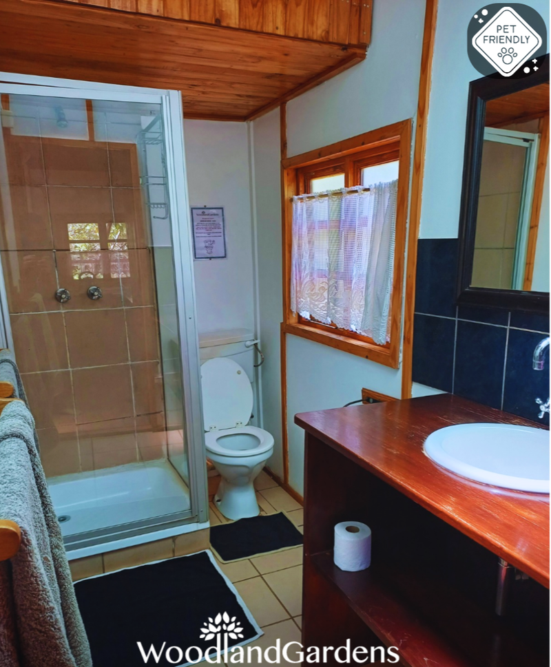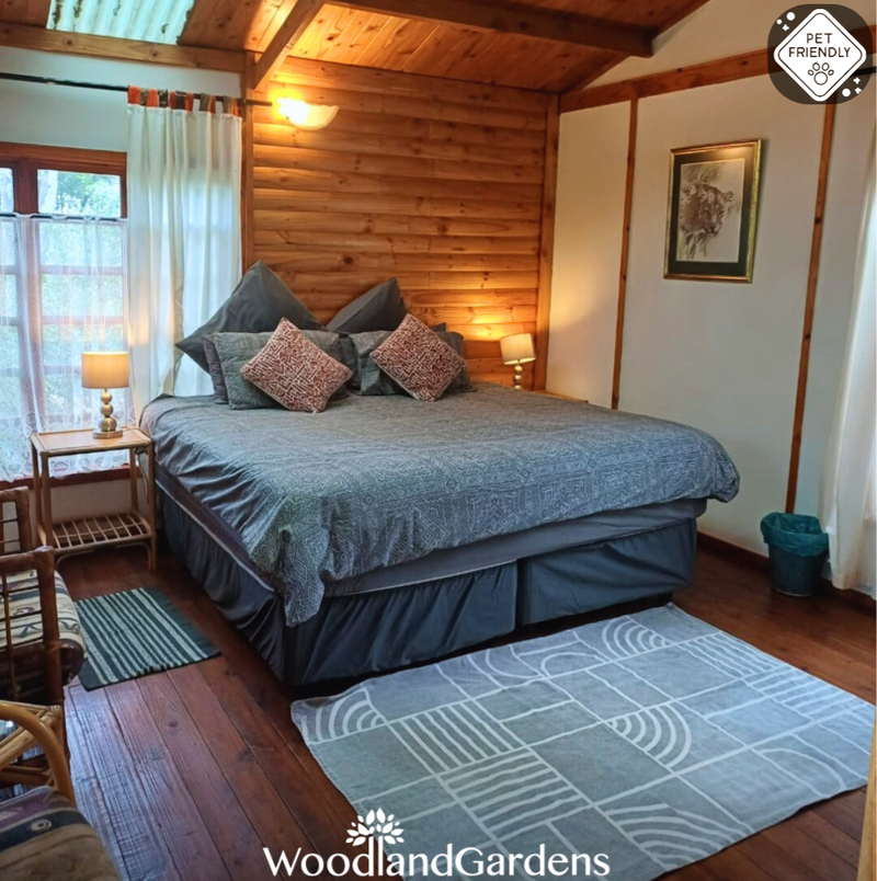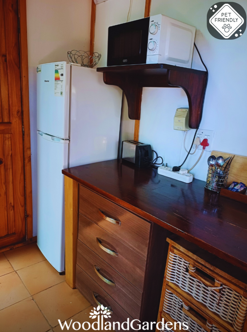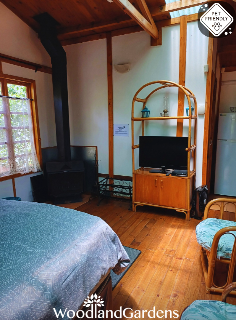 Open plan bedroom (king sized bed or two singles) with a fireplace, TV monitor with media ports (no DSTV) and a DVD machine. Separate bathroom with a shower (attached outdoor bath house). Small open plan fully equipped kitchenette (regrettably no oven, stove only). Doors opening onto a veranda, with tables and chairs overlooking a privately enclosed fenced and gated garden equipped with braai and bonfire areas.