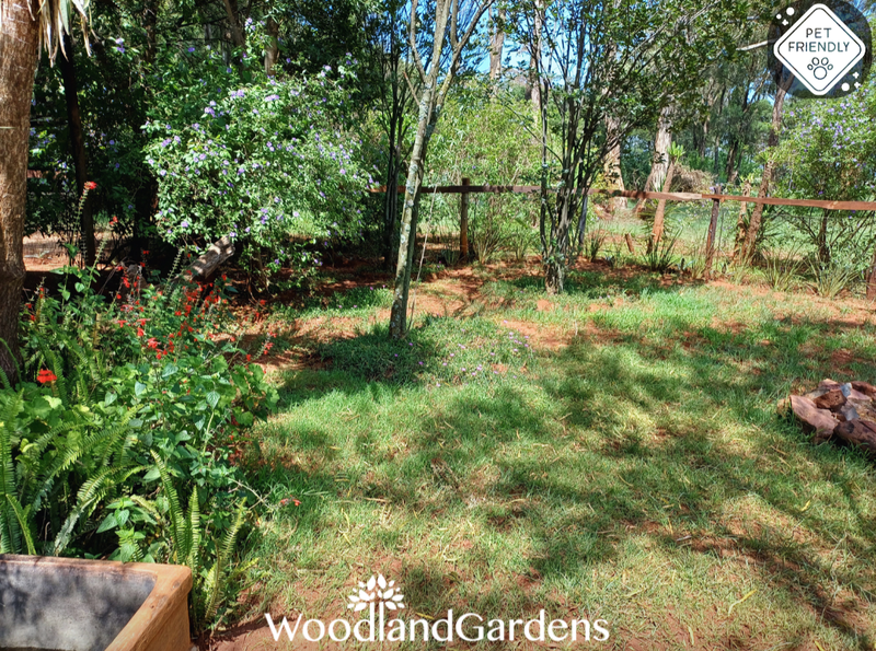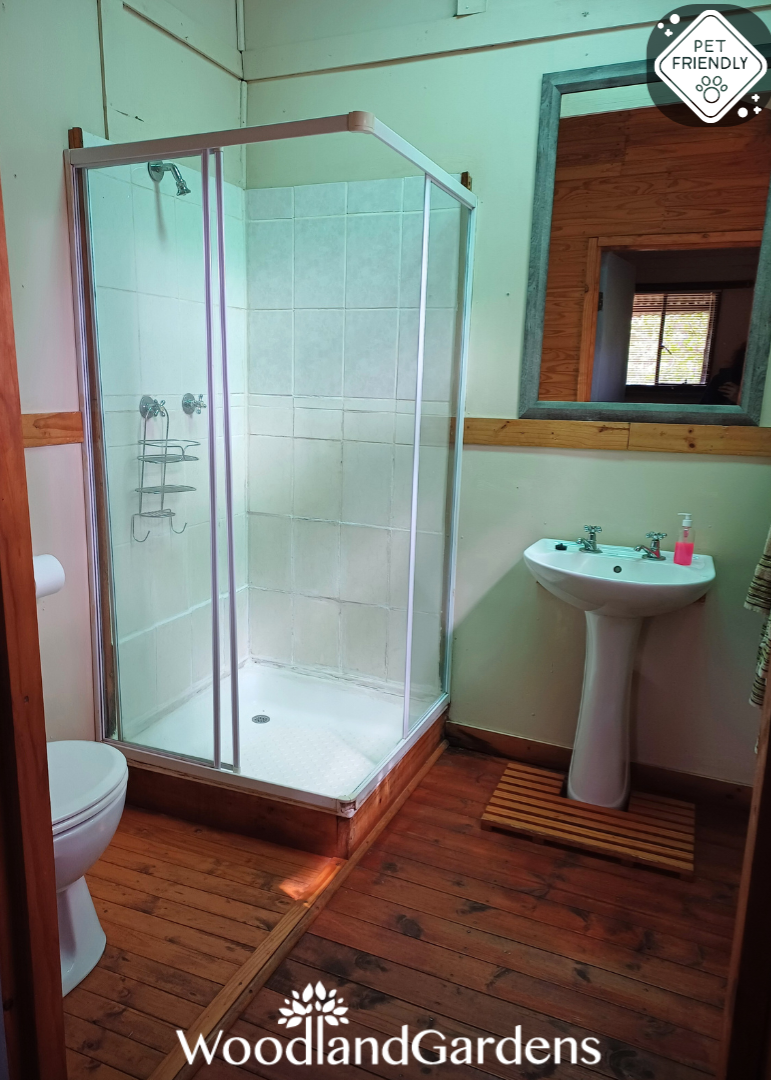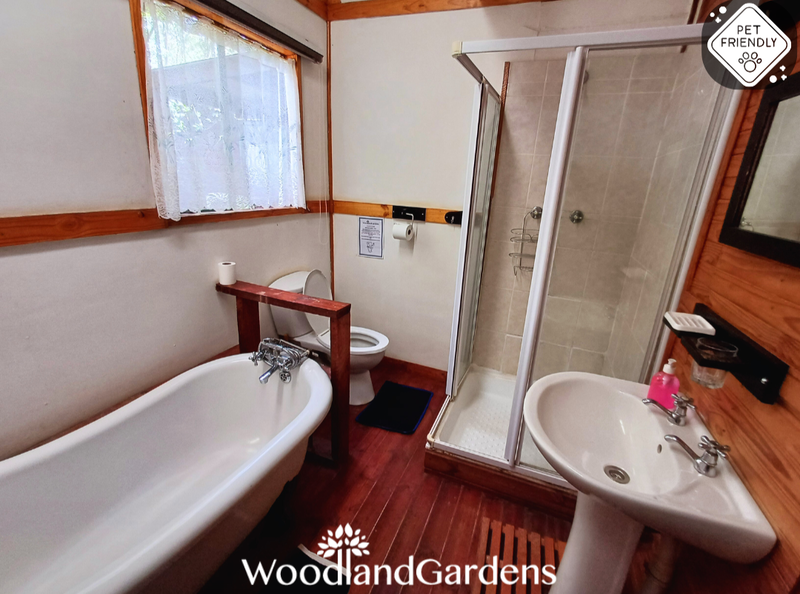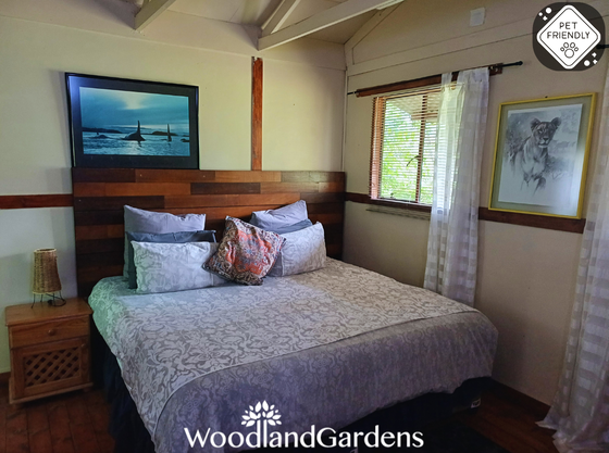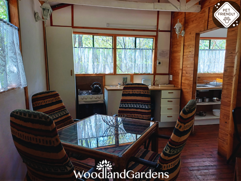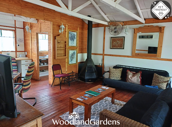Separate bedroom 1 (king sized bed or two singles) and bathroom (bath and shower). Separate bedroom 2 (king sized bed or two singles) and bathroom (shower only). Outside bedroom 2 are two sets of adult sized bunk beds. Fully equipped open plan kitchen and dining area with a table and chairs. Open plan large lounge with an aircon, sleeper couch, fireplace, TV monitor with media ports (no DSTV) and a DVD machine. Lounge doors open onto a veranda, with tables and chairs, overlooking a privately enclosed fenced and gated garden equipped with built-in seating, braai and bonfire areas.
