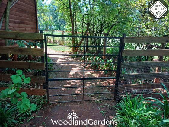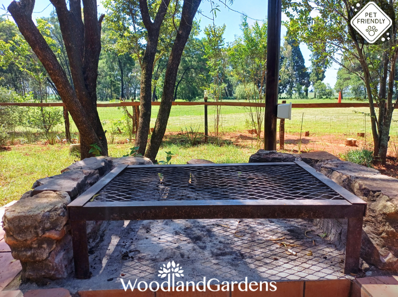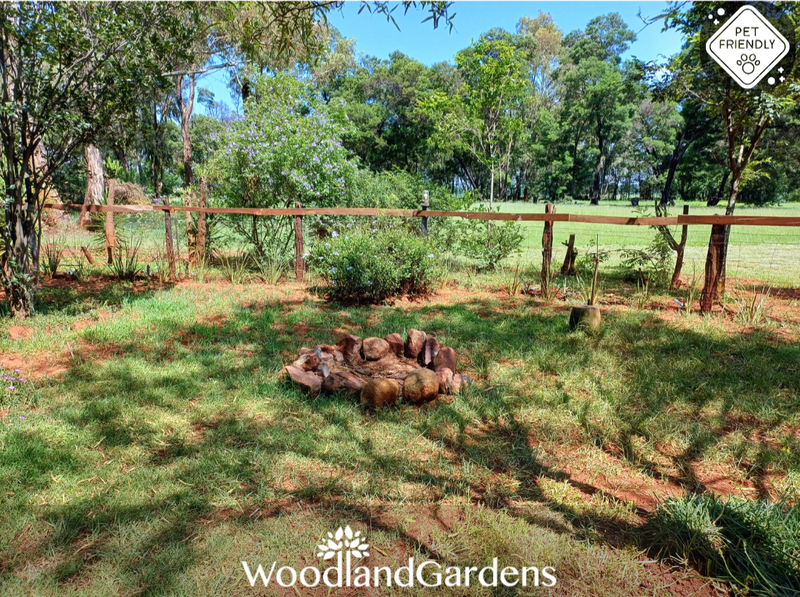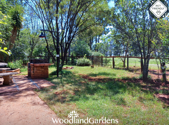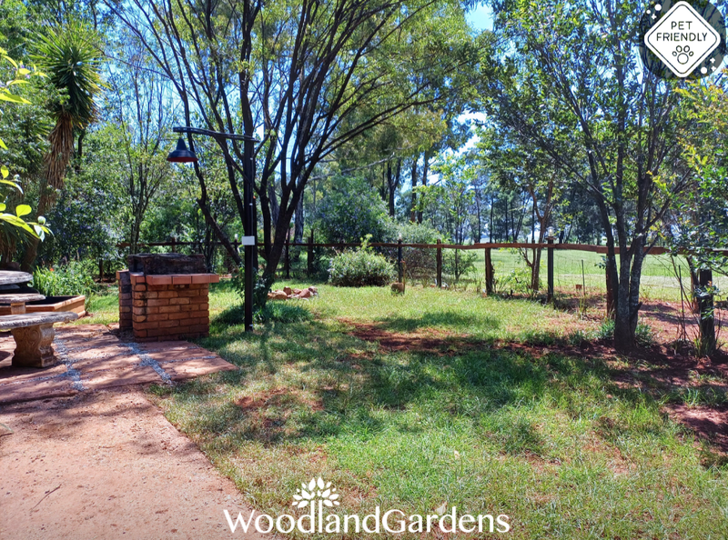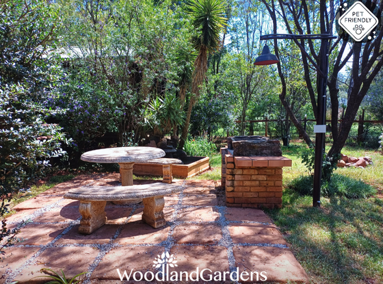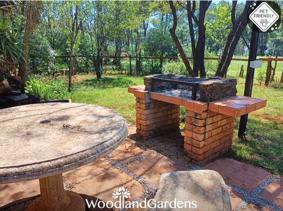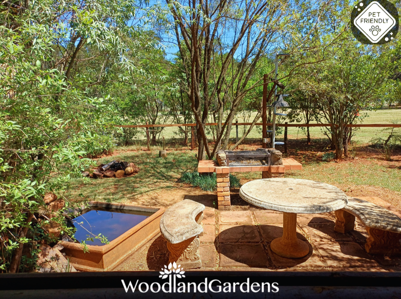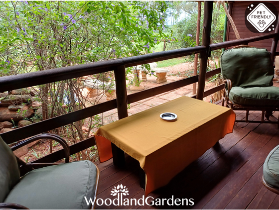 🌿 Veranda with chairs and a table overlooking a private garden space, fully fenced and gated, with built in outdoor seating and 🔥 braai and bonfire areas.