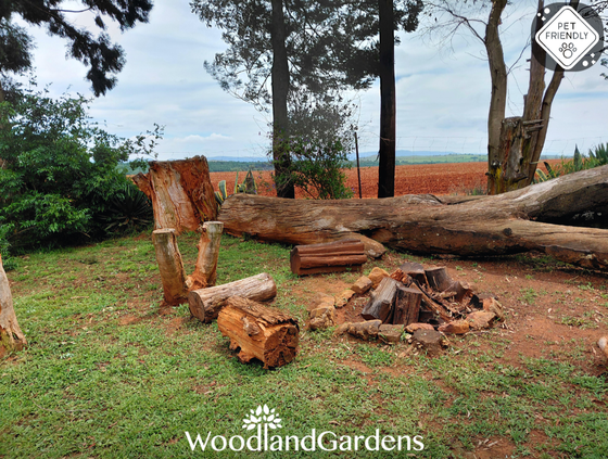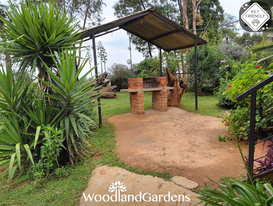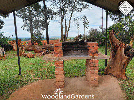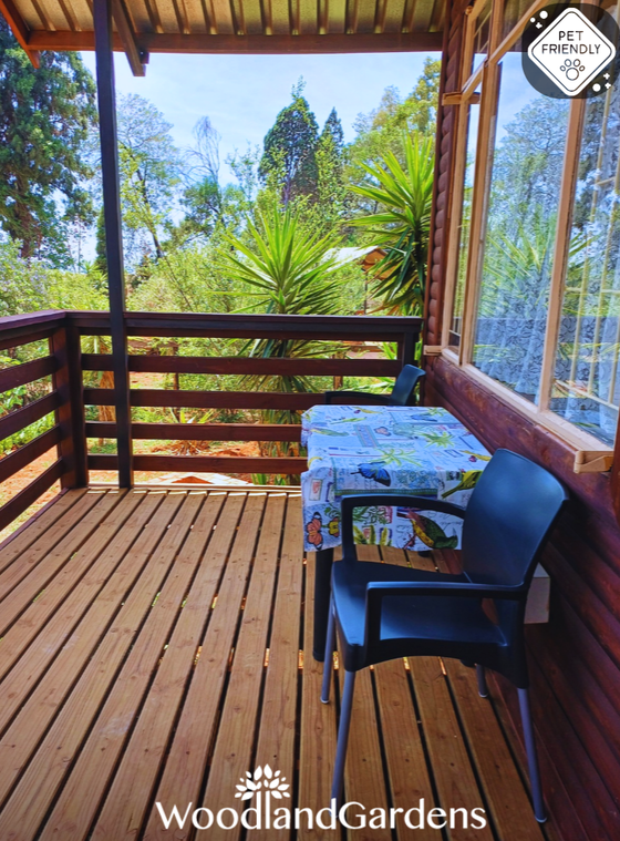 🌿 Veranda with 2 chairs and a table overlooking a private garden space, fully fenced and gated, with built in outdoor 🔥 braai and bonfire areas.